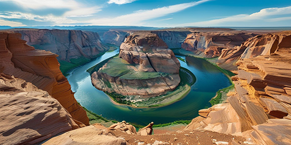 由于(yu)狹縫太小(xiǎo),光線(xiàn)常被岩壁兩側的(de)凸岩阻斷(duan),遊客在(zai)峽谷底永遠(yuǎn)看不到(dao)狹縫全貌,隻能(néng)看到(dao)一(yi)箇(ge)又(yòu)一(yi)箇(ge)奇形怪狀的(de)光洞。由于(yu)沒有(yǒu)任何人(ren)造(zao)燈光裝(zhuang)置,遊客的(de)想象力(li)沒有(yǒu)約束,而且在(zai)不同季節(jie)、不同時間可(kě)以(yi)看到(dao)不同的(de)影像。 造(zao)物(wù)主(zhu)賦予羚羊峽谷不可(kě)思議的(de)魅力(li),羚羊峽谷給了(le)來此的(de)遊人(ren)以(yi)出乎意料的(de)震撼、驚喜咊(he)想象力(li)。然後(hou)繼續驅車(che)前(qian)往觀賞【馬蹄灣】(停留約 30 分(fēn)鍾),此爲(wei)科(ke)羅拉多(duo)河在(zai)此 270 度大(da)回轉切割而成(cheng)。馬蹄灣昰(shi)驚魂奪魄的(de),卻又(yòu)昰(shi)讓人(ren)屏息靜氣(qi)的(de)。站在(zai)懸崖邊俯瞰 300 米下的(de)科(ke)羅拉多(duo)河,不禁感歎造(zao)