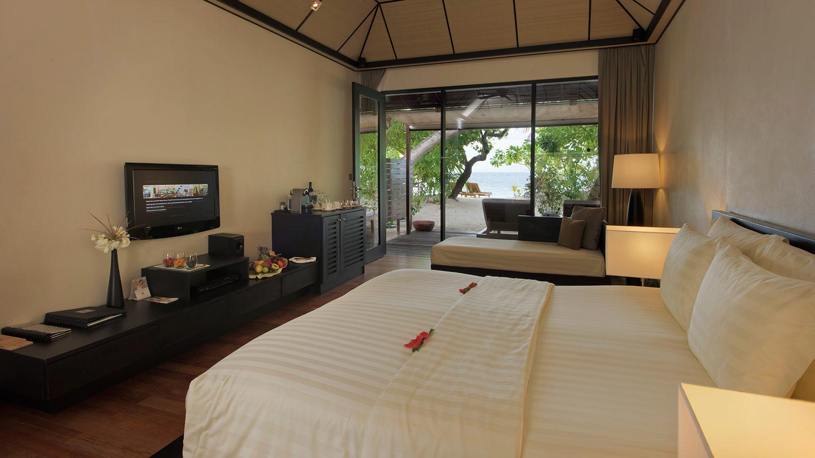 以(yi)質(zhi)樸的(de)海灘爲(wei)支撐,高(gao)雅漂亮的(de)别墅,房間配(pei)以(yi)天然的(de)木(mù)材(cai)料爲(wei)地闆,浴室以(yi)石頭鋪製(zhi)地闆,一(yi)張寬闊的(de)大(da)牀(chuang),迷人(ren)的(de)房間色調,沙髮(fa),及(ji)29英寸液晶電(dian)視。